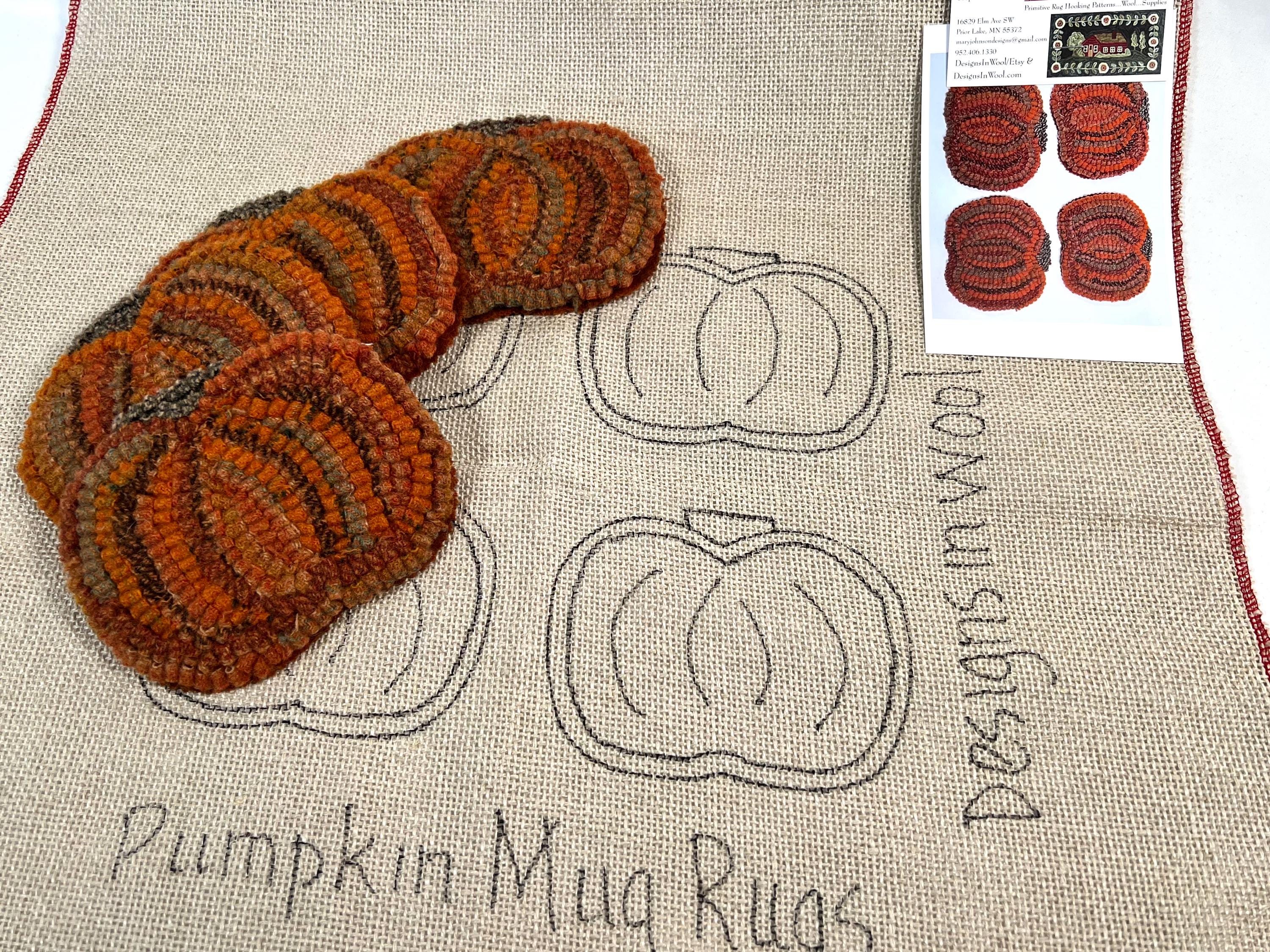 This listing is for the rug hooking PATTERN "Pumpkin Mug Rugs" on your choice of cotton monks cloth or primitive linen. This is for the PATTERN ONLY, not the finished mats. A 4" x 6" photo and finishing instructions are included with the pattern. It does not include instructions on how to hook.
