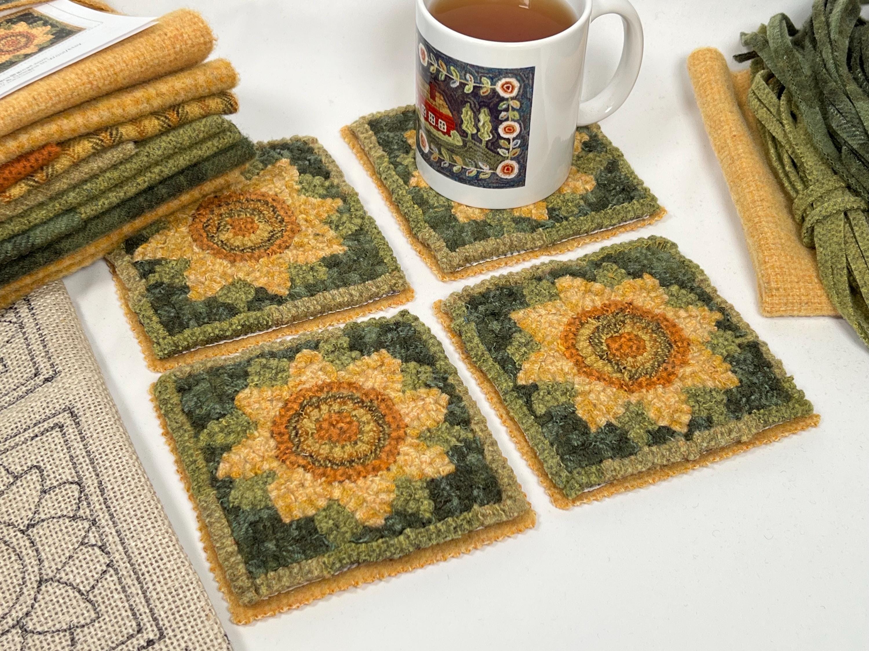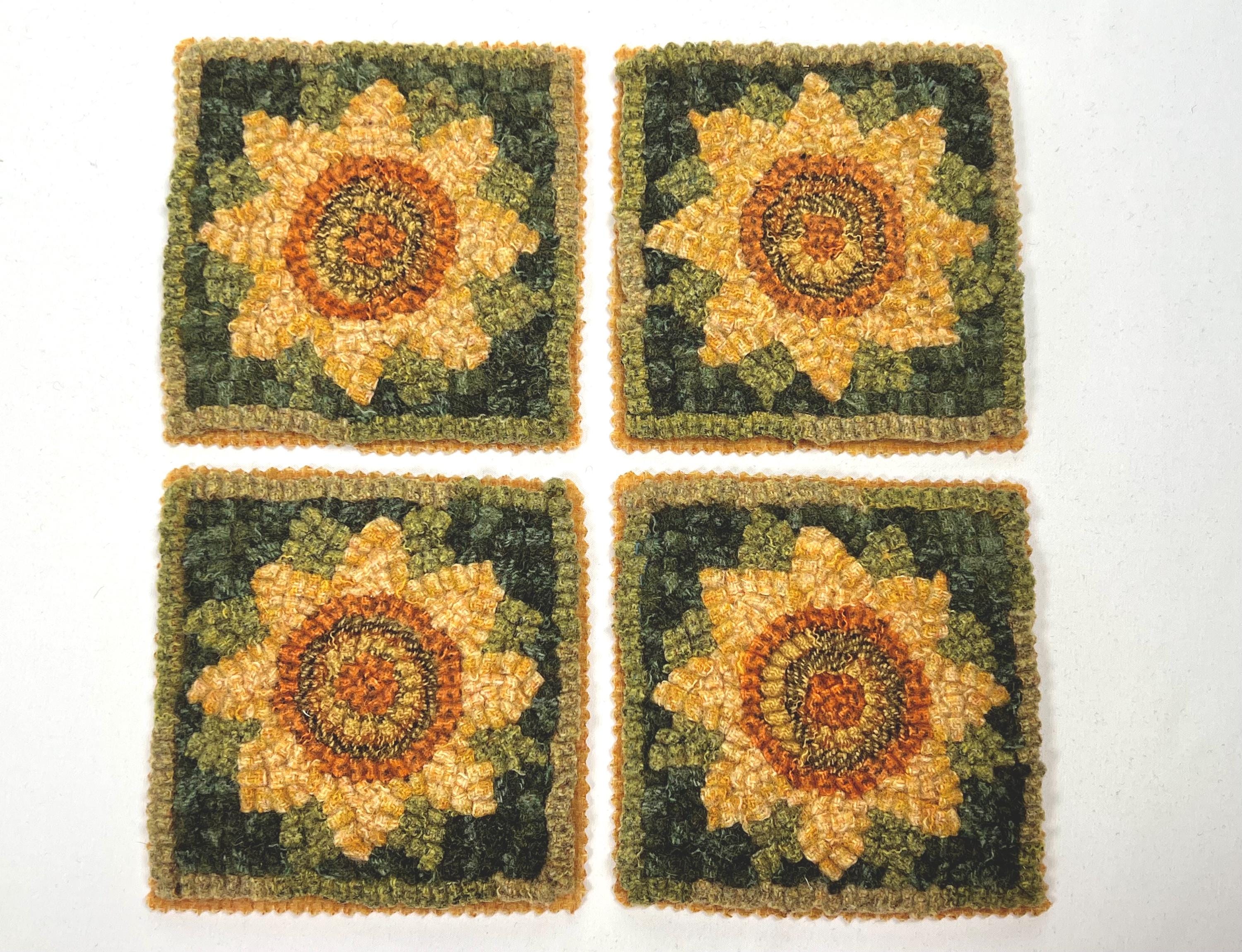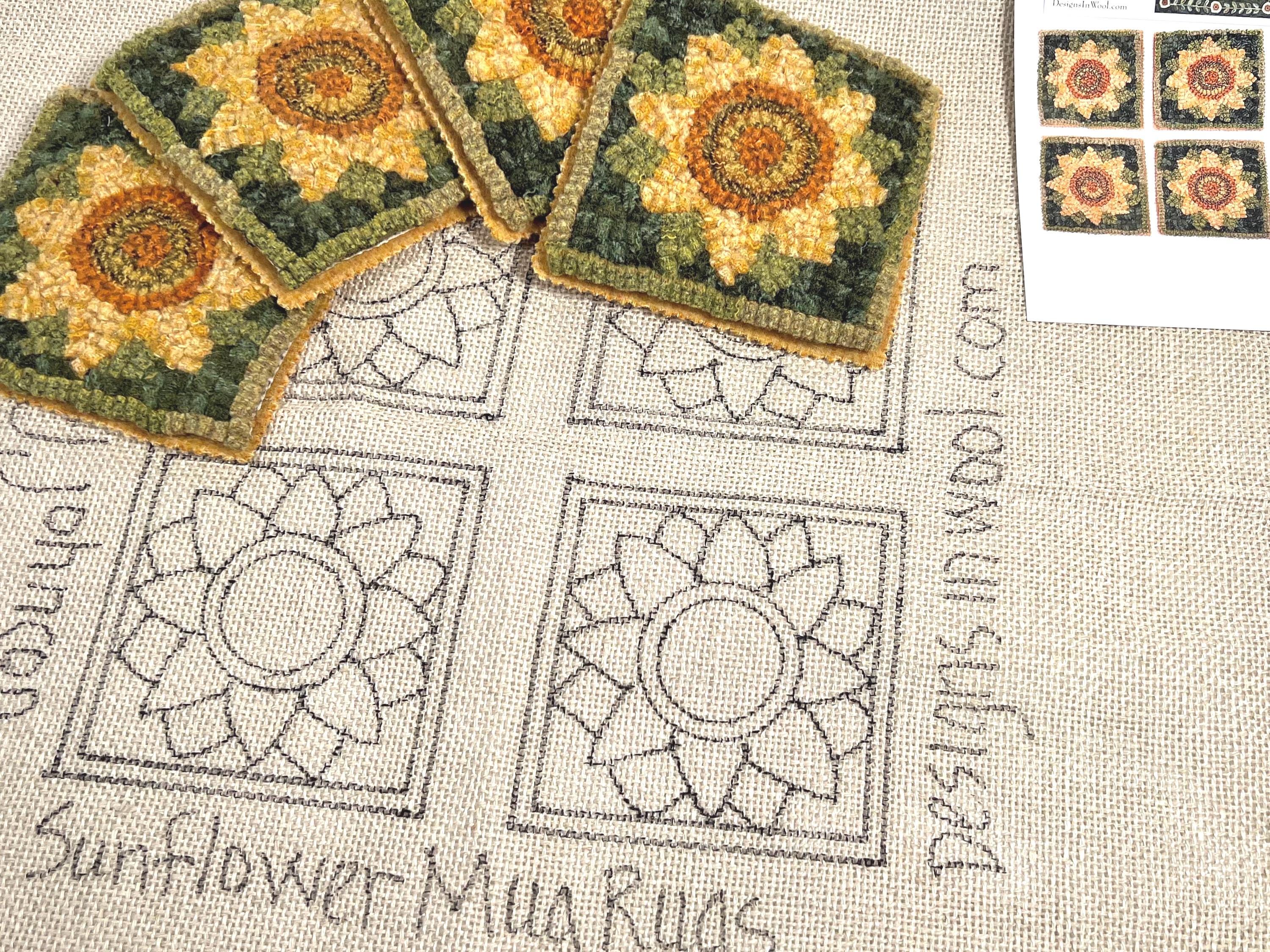 This listing is for the rug hooking pattern "Sunflower Mug Rugs" on your choice of cotton monks cloth or primitive linen. This is for the PATTERN ONLY, not the finished mats.
