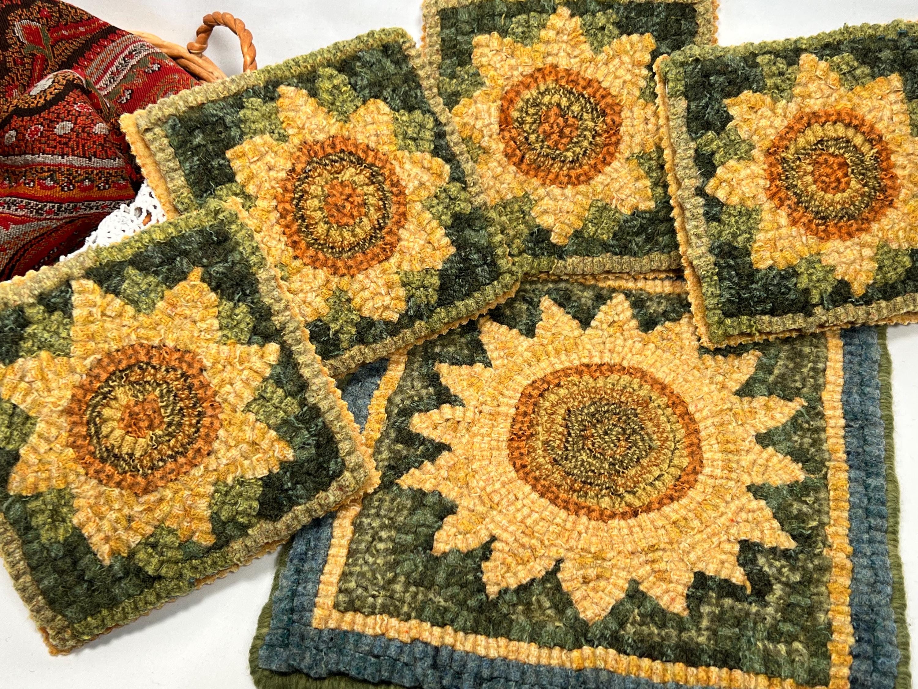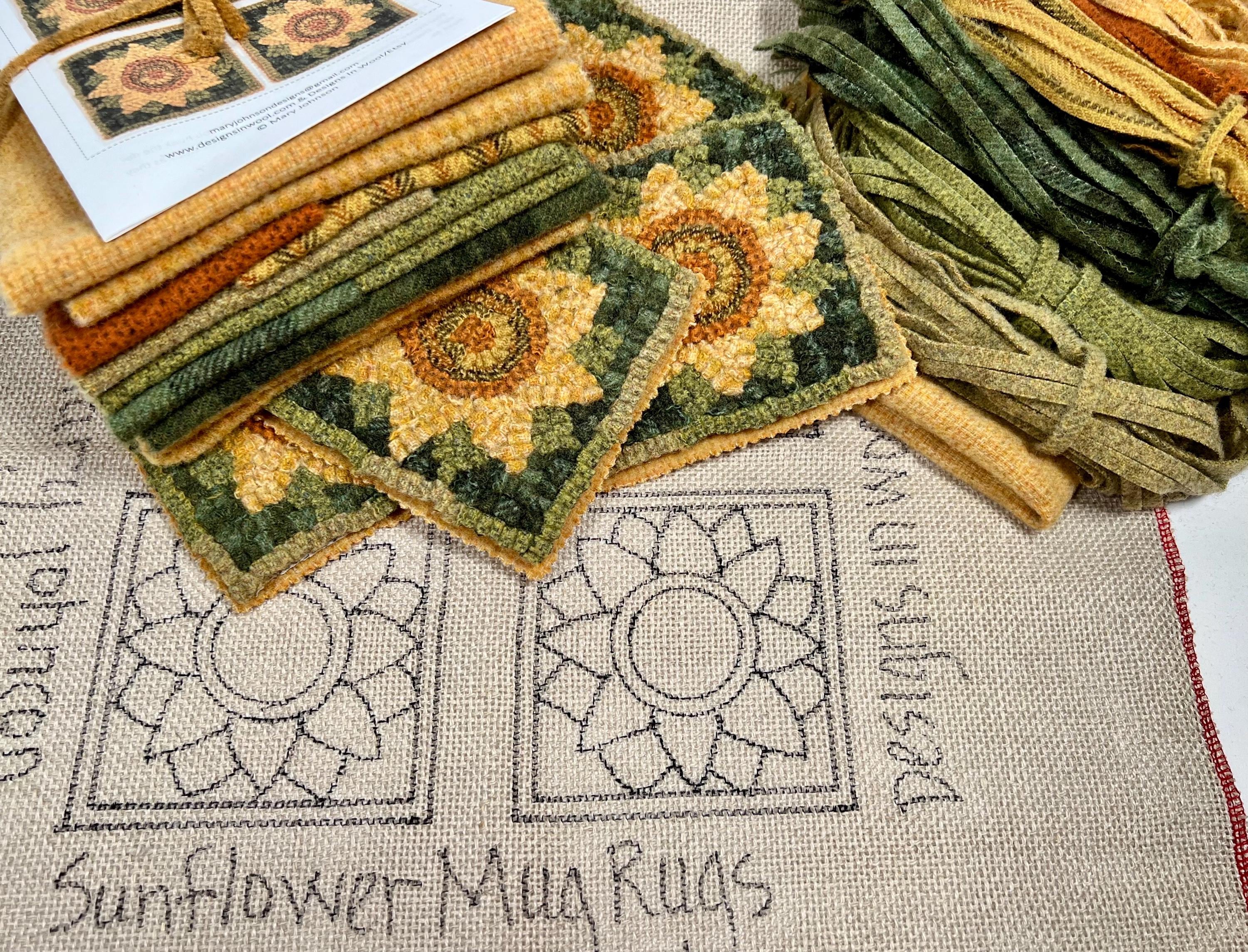 The KIT for Sunflower Mug Rugs contains the pattern and wool fabric to hook your own mug rugs.