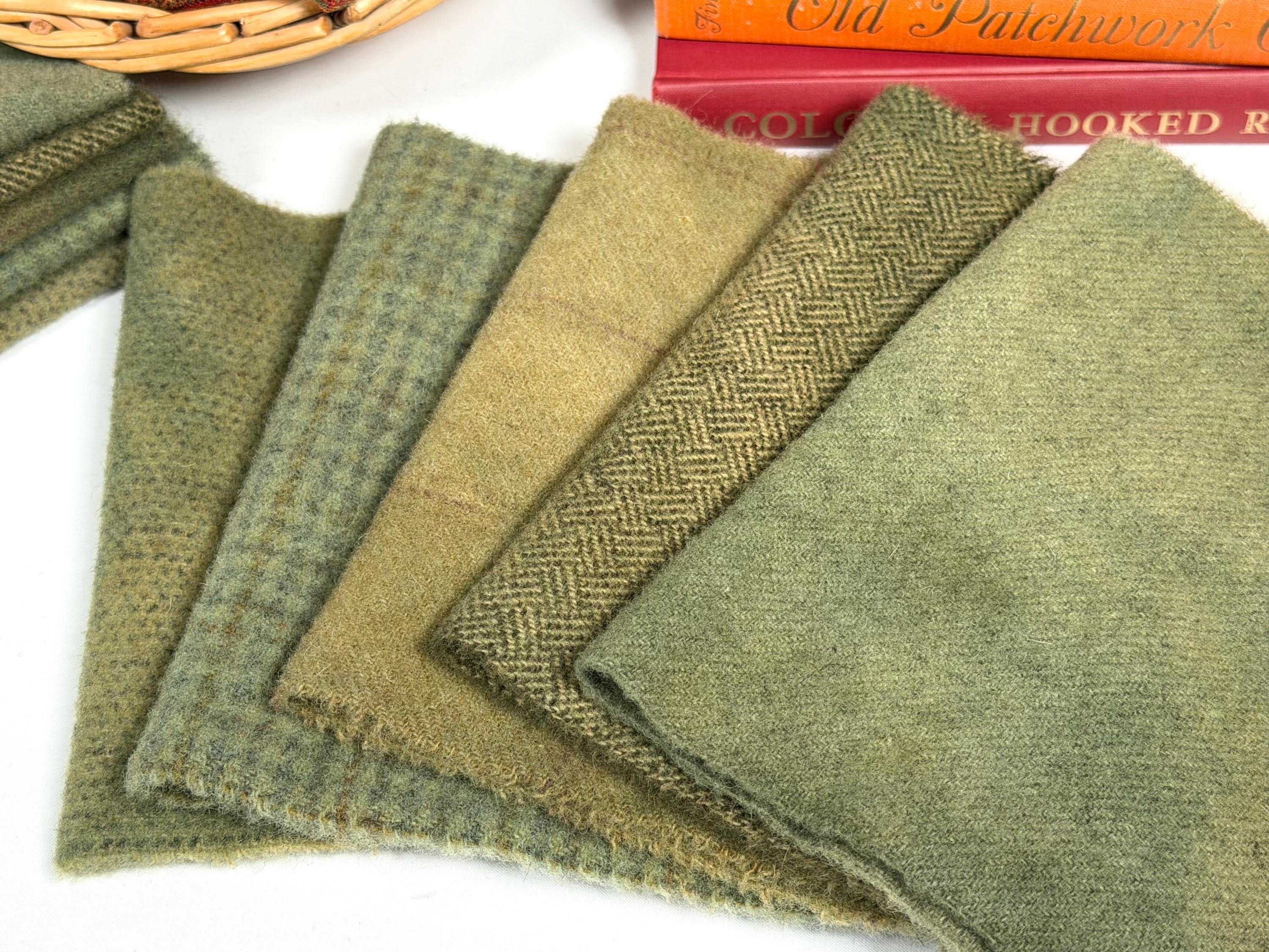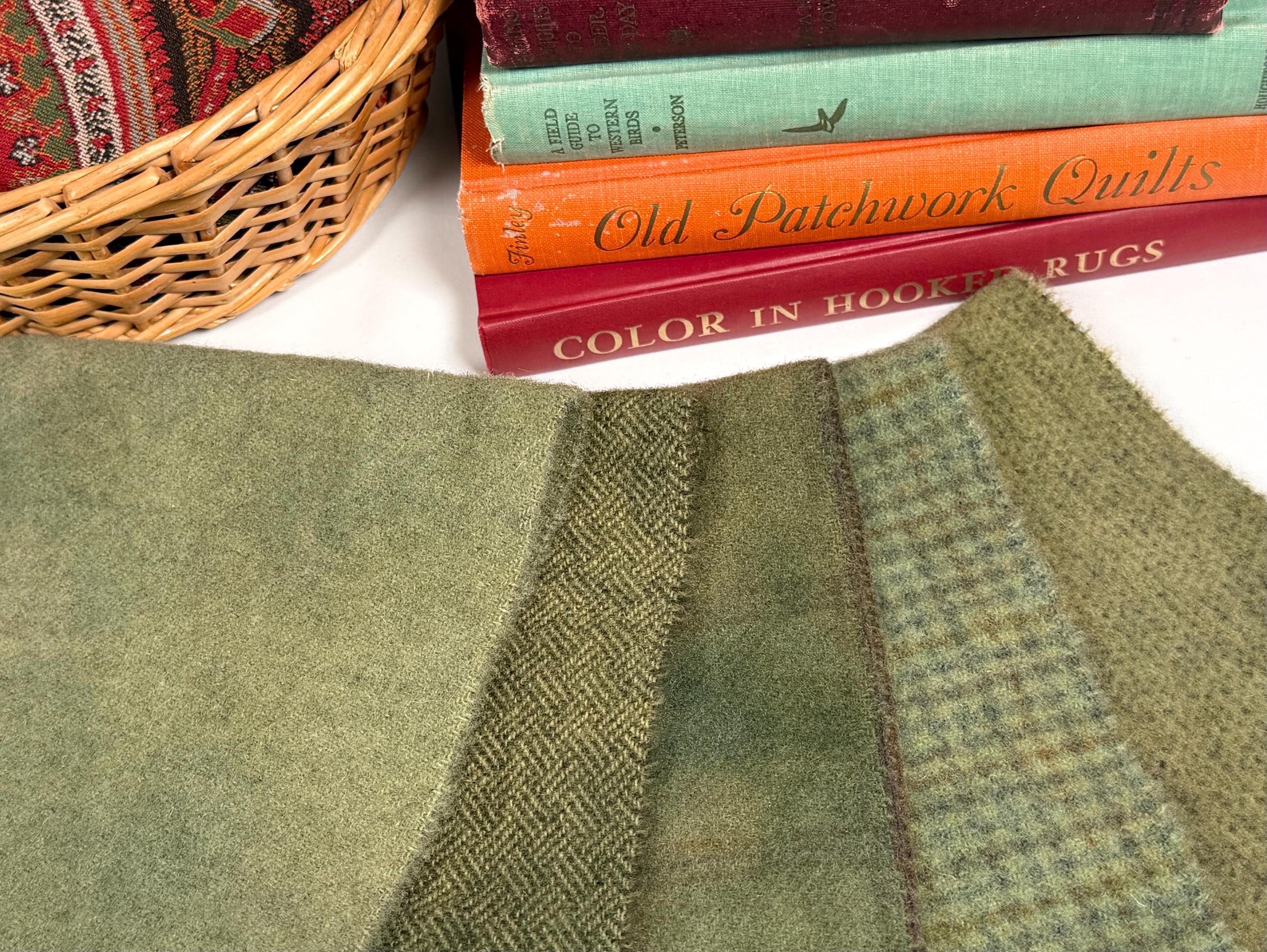 This bundle of hand dyed greens are a mix of green shades over wonderful textures. Five fat sixteenths of 100% wool fabrics that I have hand dyed and prepared for use in rug hooking, applique, sewing projects and craft projects. The pieces measure approximately 6" x 15-16" each.