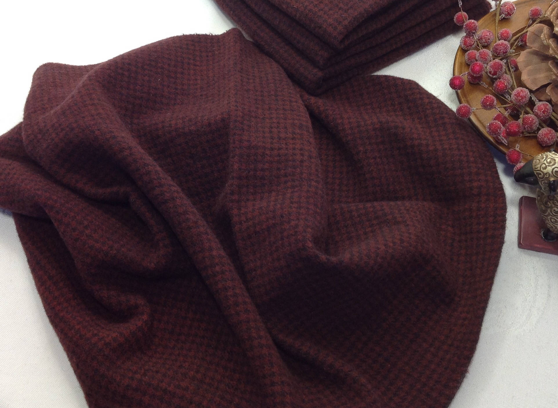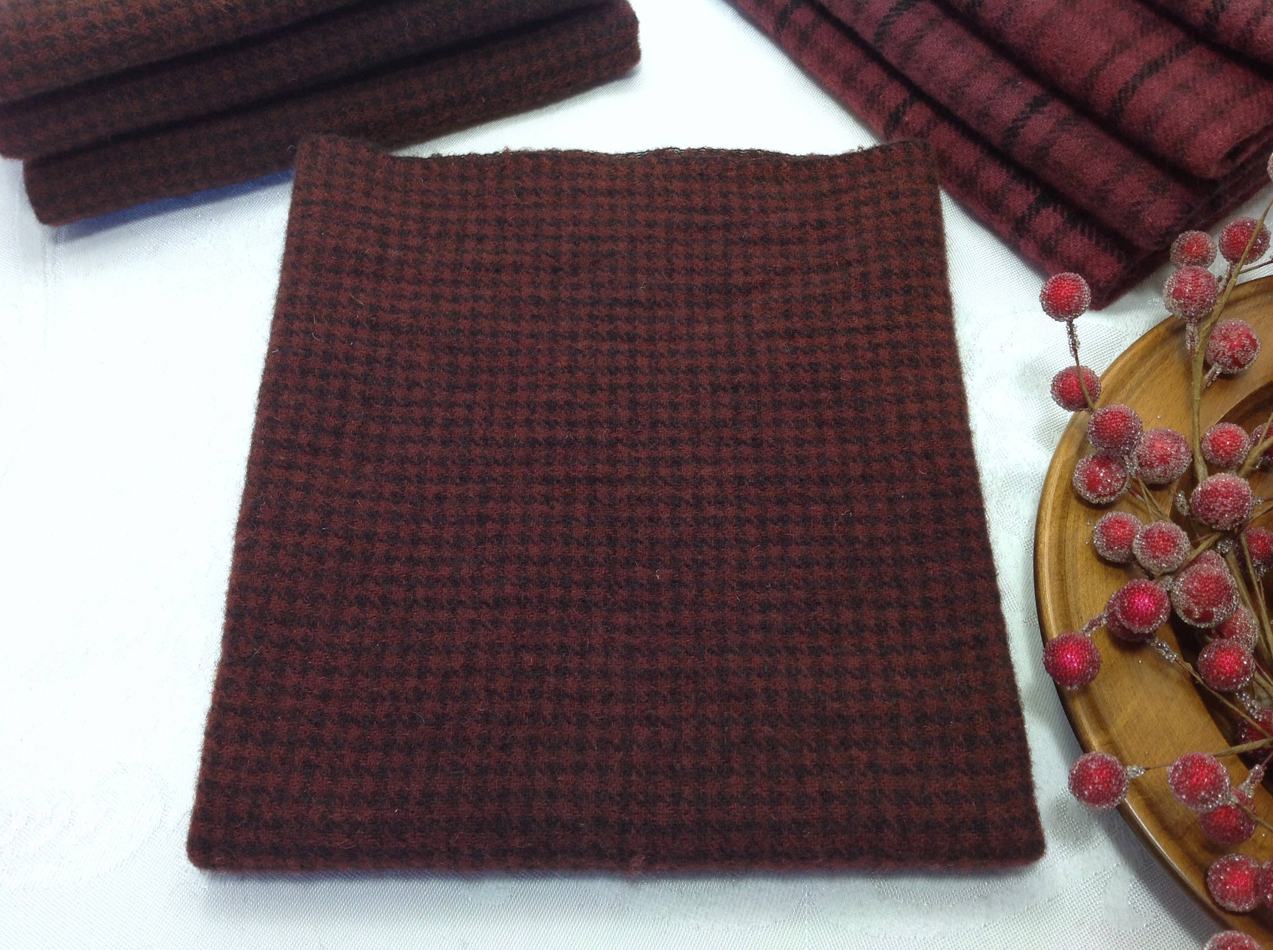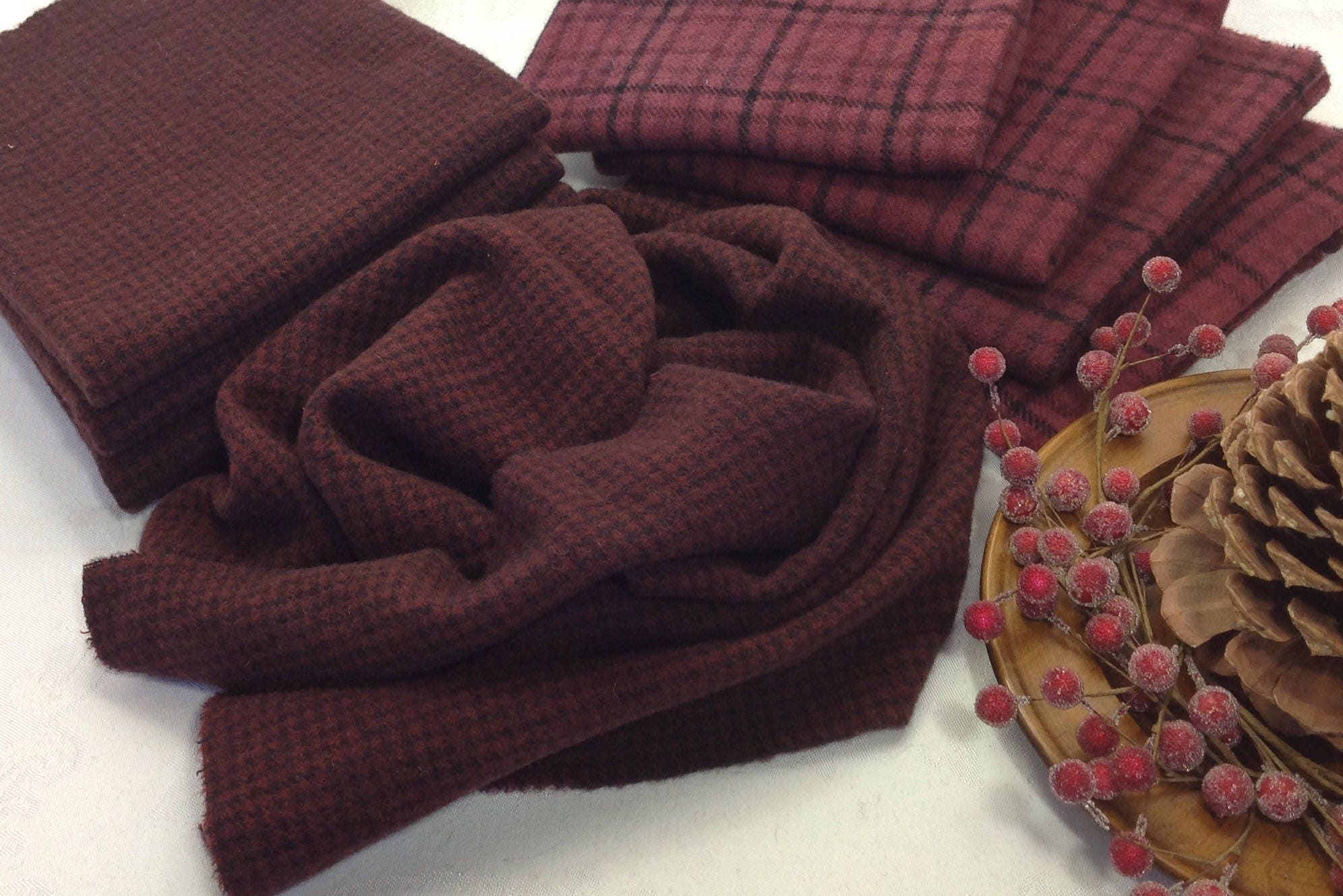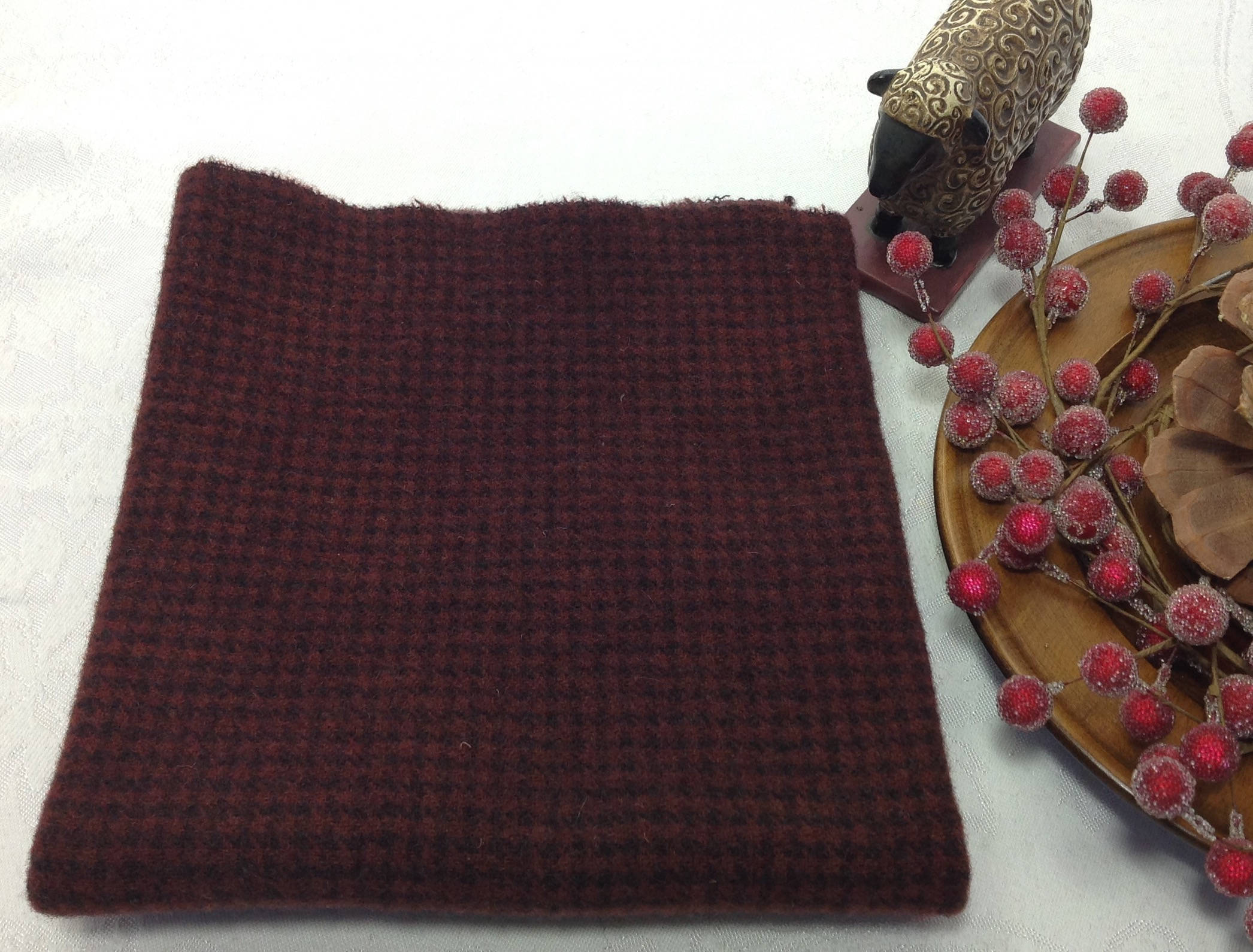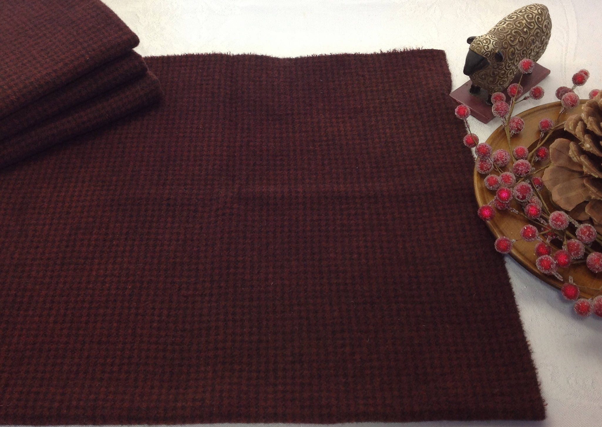 This listing is for 1) fat quarter yard of hand dyed 100% wool fabric. I have over dyed a tiny check with a rich red recipe that resulted in this rich deep burgundy color. Other red colors that could be used are maroon, claret, cabernet, wine red, raisins.