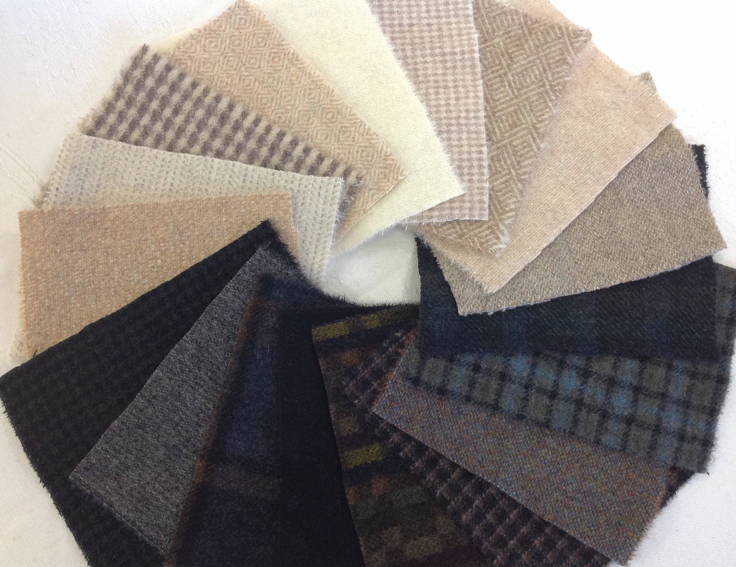 A collection of mill dyed wool fabrics, all are washed and felted, ready to use for making small wool treasures! There are 18 pieces approximately 5" x 6" or a little larger. See photo with ruler.