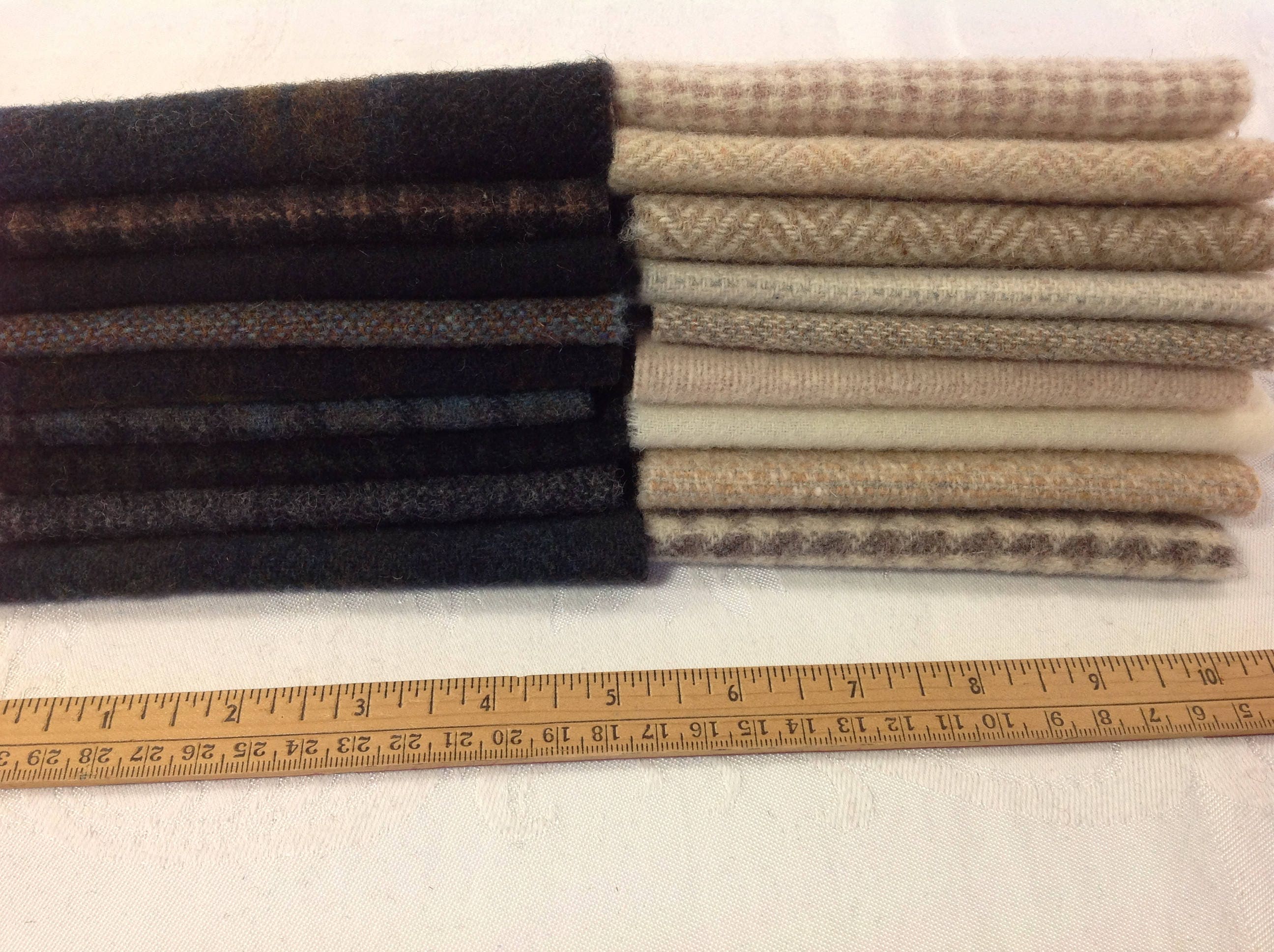 Bits and pieces gathered from my projects and kits, they are perfect for appliqué, quilting, doll clothes, and wool crafting. Not for use in rug hooking as they are too small.
