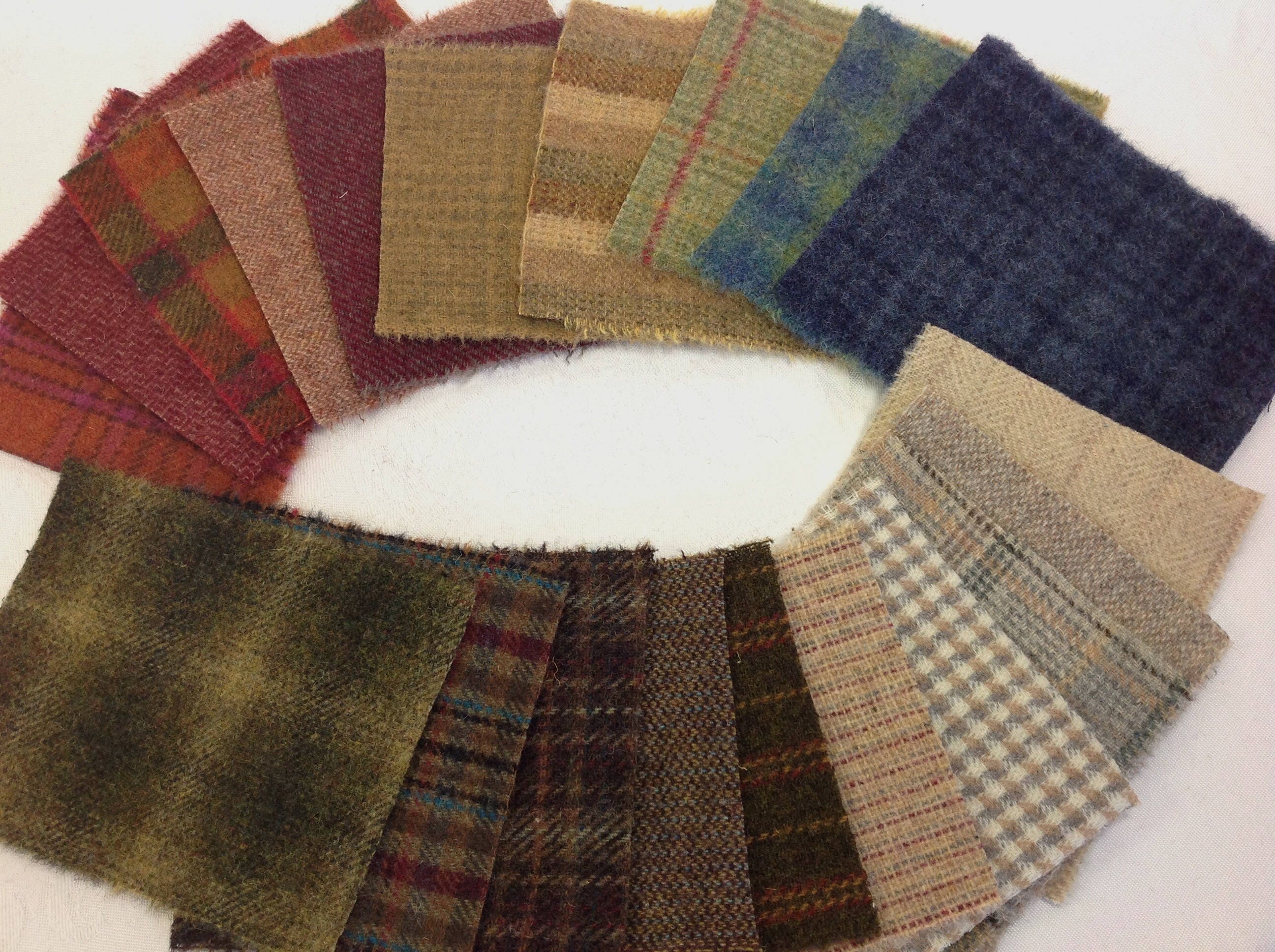 A great mix of textures and colors including browns, reds, golds, greens, blues, and neutrals. All are medium weight, 100% wool fabric and will work well for appliqueing, quilting, sewing and crafting. Use for pincushions, pin keeps, make dos, purses, thread and needle cases, pouches, table runners, candle mats....oh so many ideas!