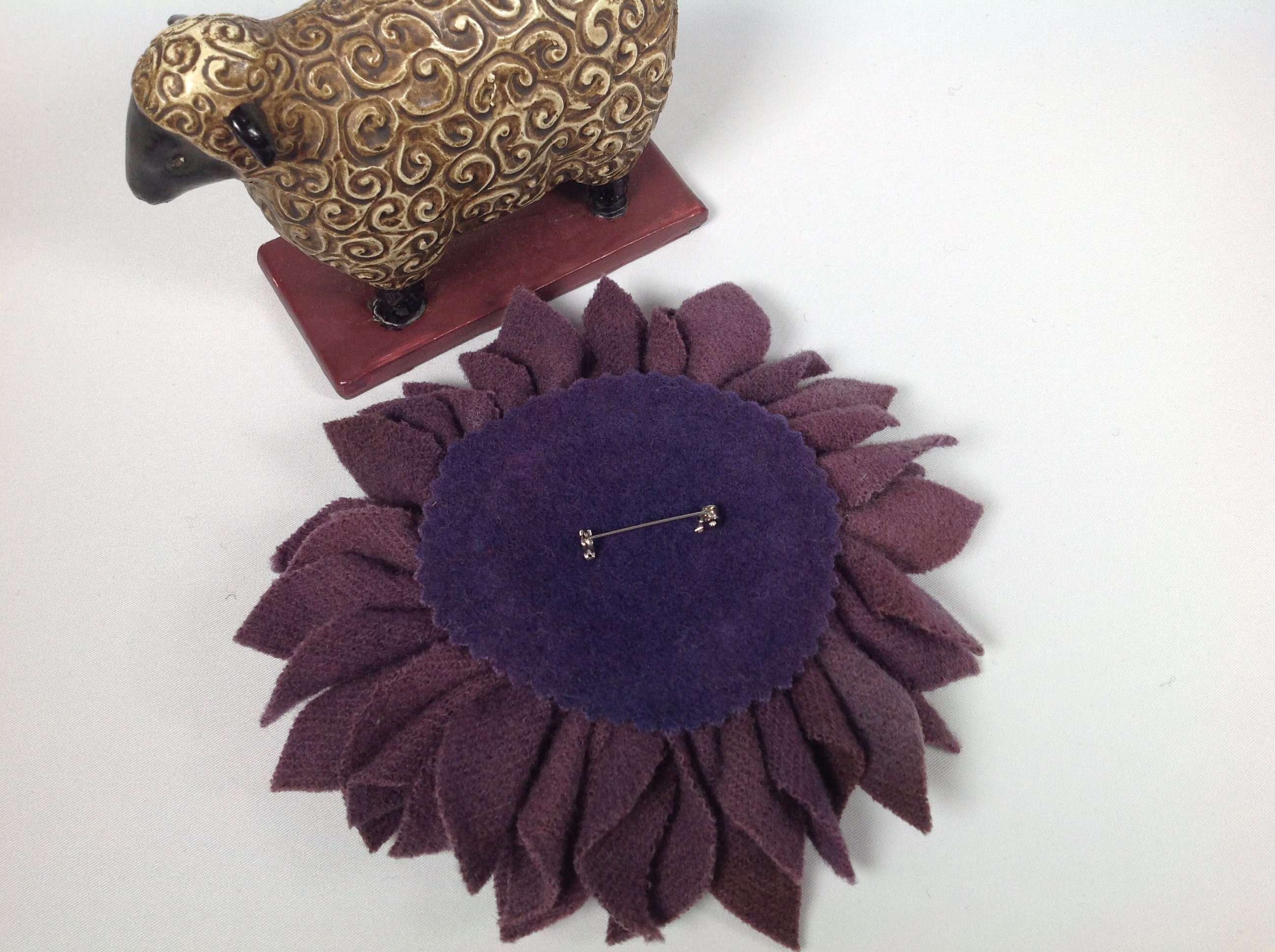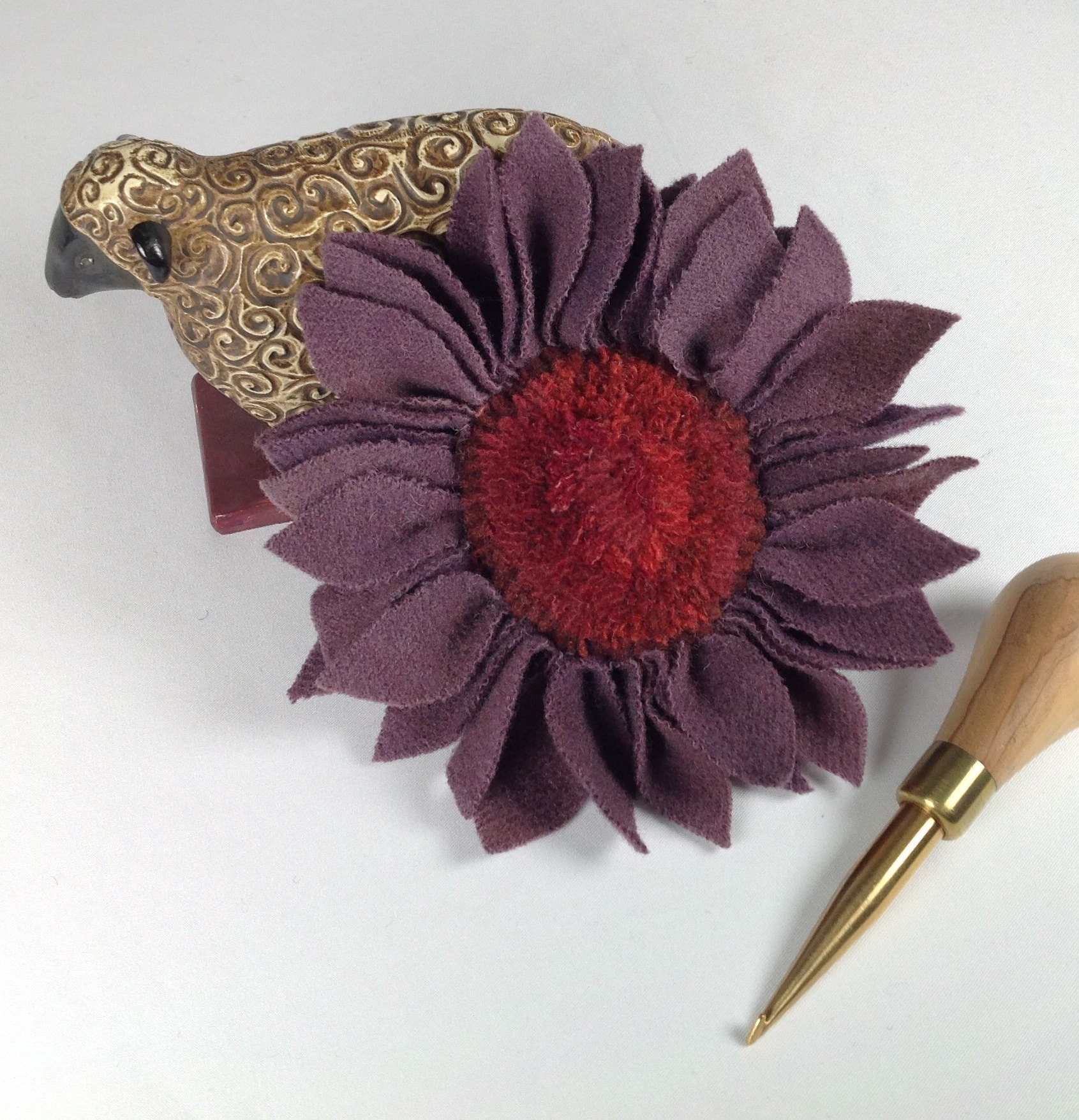 This wool flower pin has been hand hooked and prodded by me with hand dyed and felted wool.